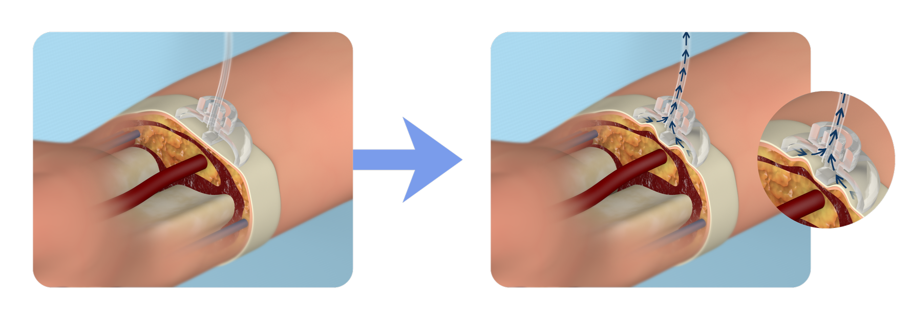 Under controlled suction, SAPH gently lifts the skin and subcutaneous tissue, approximating the arteriotomy and tissue between the arteriotomy and device to a soft external seal. This topical apposition is designed to support hemostasis without circumferential compression to help preserve antegrade flow through the radial artery. Intrinsic blood pressure and clotting factors then contribute to natural healing.